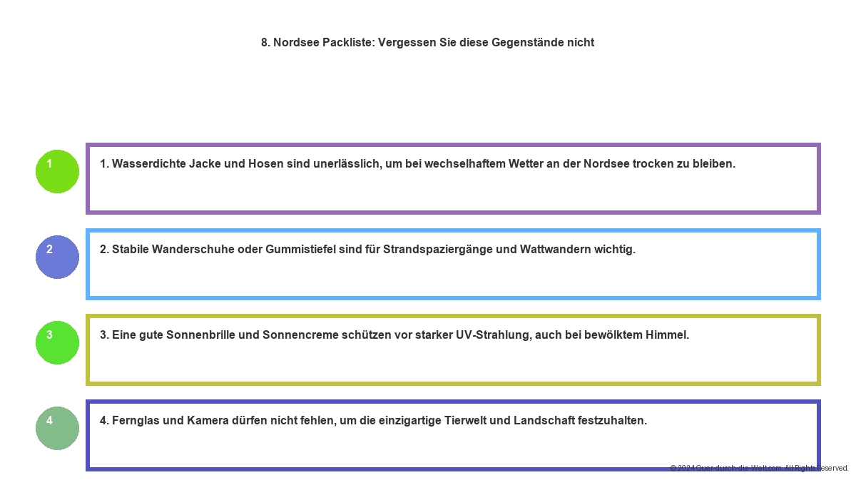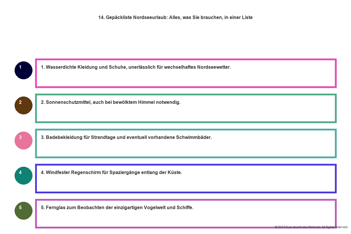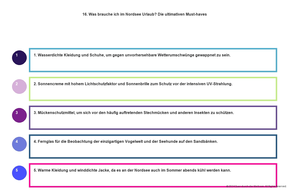 Mit diesen Tipps zur Reisevorbereitung sind Sie gut ausgerüstet, um die Nordsee in all ihrer Vielfältigkeit zu genießen, ohne von wechselhaftem Wetter beeinträchtigt zu werden.