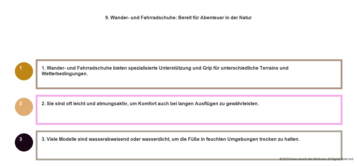 - Wander- oder Fahrradschuhe: Entdecken Sie die Natur auf bequemen Sohlen.