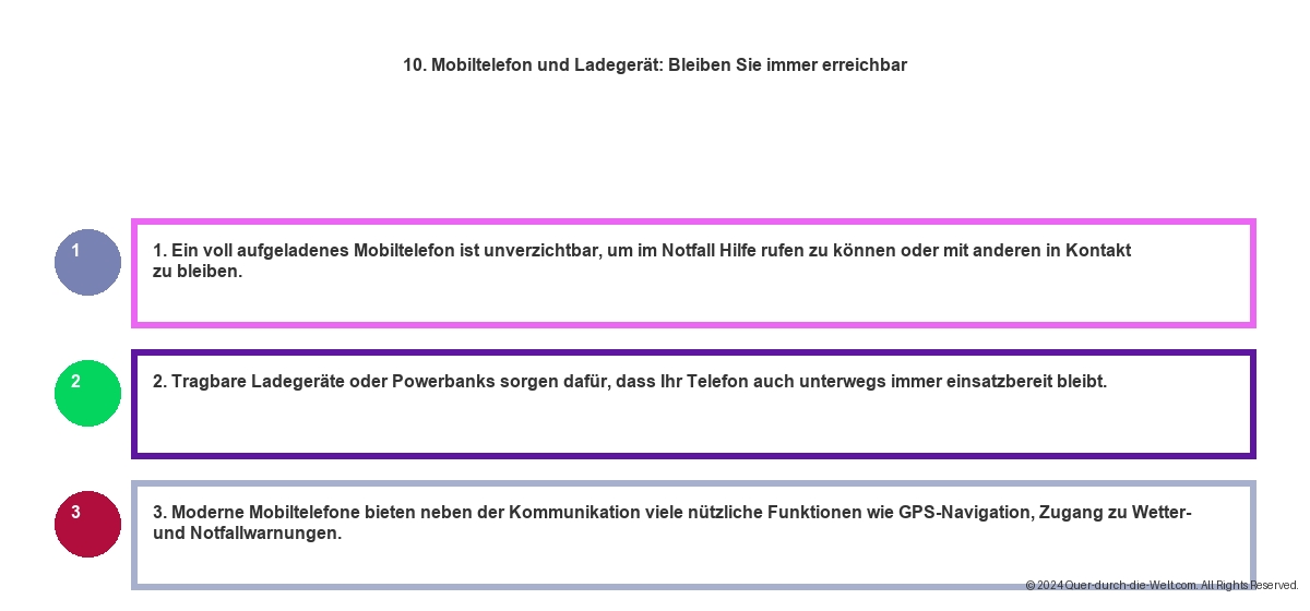 Ein zusätzlicher Rucksack oder eine Tasche für Tagesausflüge kann sehr nützlich sein. Powerbank und Adapter nicht vergessen, um unterwegs stets erreichbar zu sein.