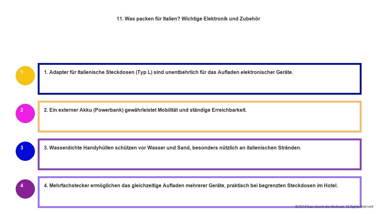 Nun, da wir den Inhalt Ihrer Koffer durchgegangen sind, vom unerlässlichen Sonnenschutz bis hin zu bequemen Wanderstiefeln, sollten Sie gut auf Ihren Italien-Urlaub vorbereitet sein. Doch bevor wir uns verabschieden, hier noch einige letzte Tipps, die Ihren Aufenthalt noch angenehmer machen können: