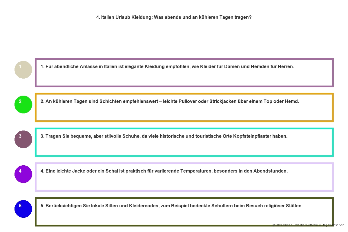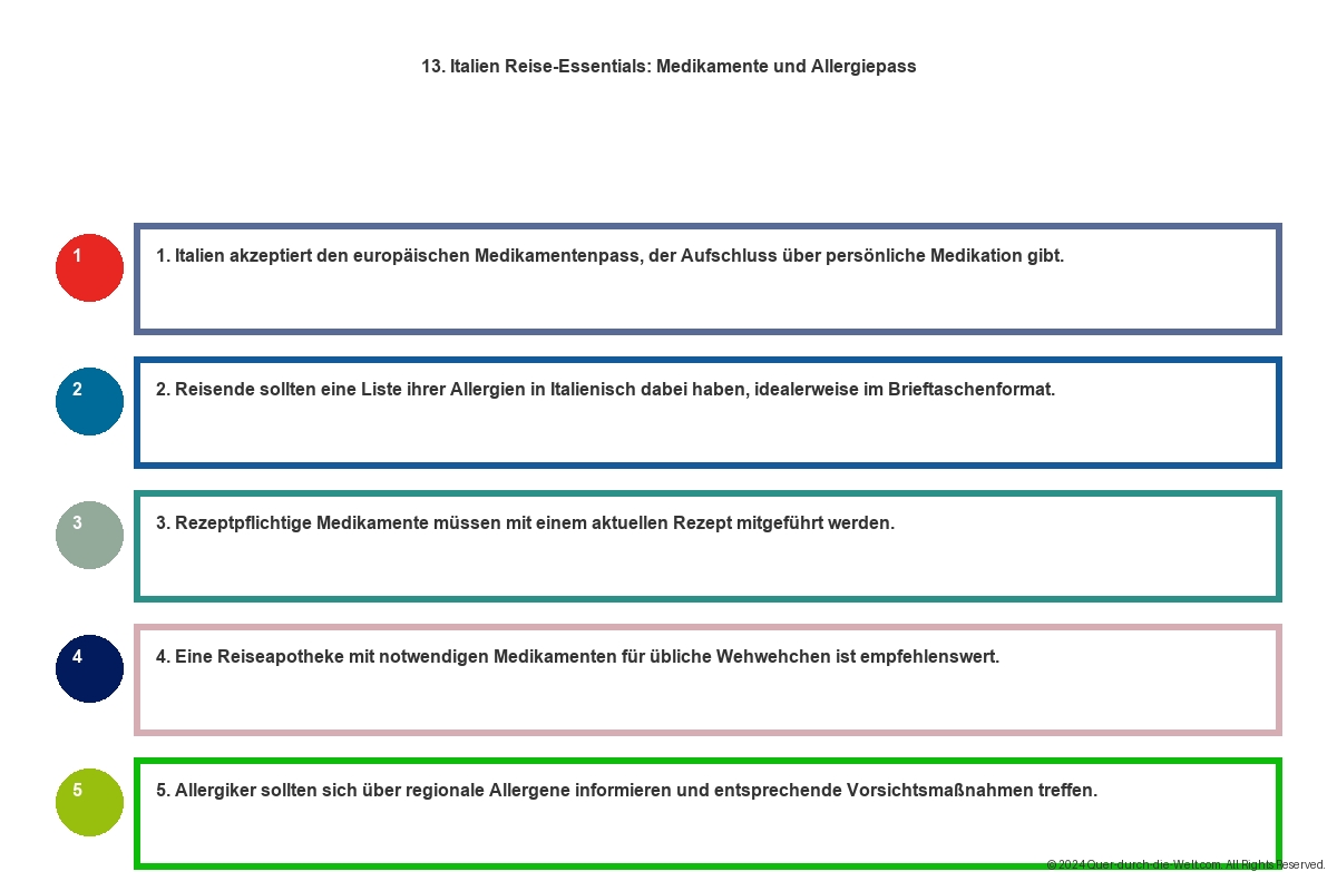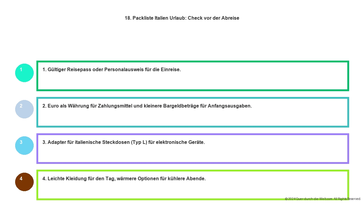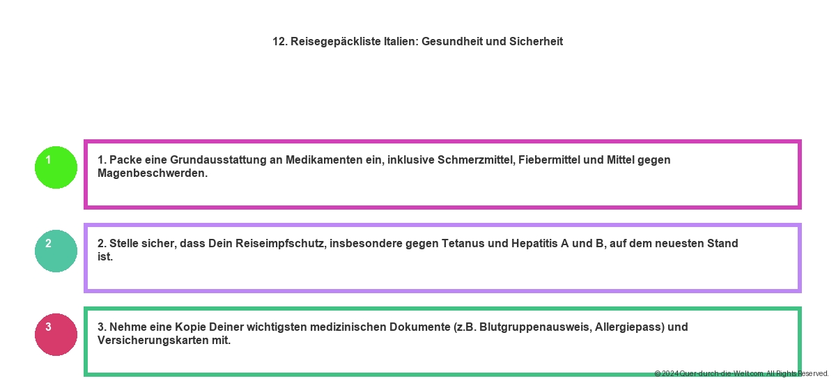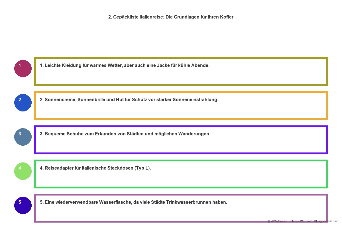 Denken Sie daran, dass eine gute Vorbereitung der Schlüssel für eine sorglose Reise ist. Diese Liste soll Ihnen den Start erleichtern, doch je nach Ihren individuellen Bedürfnissen und Aktivitäten, die Sie in Italien planen, kann sich Ihre Gepäckliste erweitern. Schauen Sie auch bei unseren Tipps für Kulinarische Genüsse in Italien und Historische Sehenswürdigkeiten Italiens rein, um Ihre Reise noch unvergesslicher zu machen.