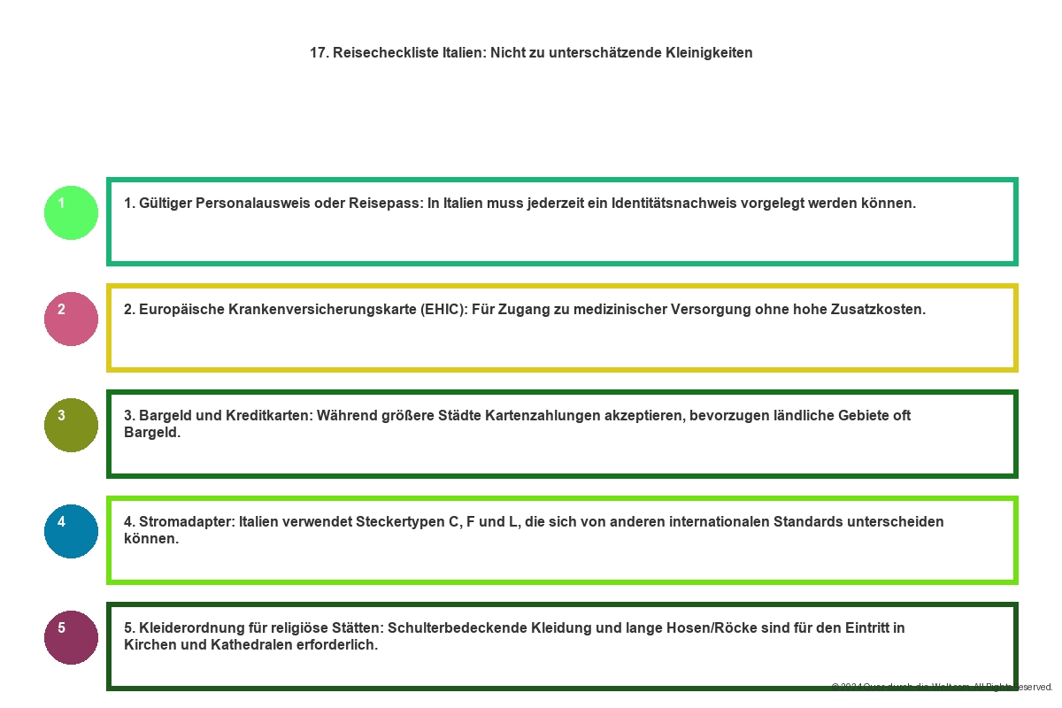 Der Countdown läuft, das Abenteuer Italien steht bevor. Um sicherzustellen, dass Sie alles Wichtige eingepackt haben, werfen Sie noch einen letzten Blick auf unsere ultimative Checkliste. Ihr Koffer sollte sowohl Must-Haves als auch angenehme Extras enthalten, damit Sie für alle Erlebnisse gewappnet sind. 🌞